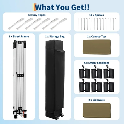 This 10 x 20 heavy duty pop up canopy tent provides reliable shade and shelter for outdoor events, markets, camping, and parties. Featuring a durable powder-coated steel frame and a waterproof, UV-resistant canopy, it offers lasting protection from sun and rain. Two removable sidewalls add wind protection and privacy, while the included roller bag ensures easy transport. Comes complete with 4 weight bags, 8 stakes, and 6 ropes for secure setup in various conditions—perfect for both commercial and recreational use.