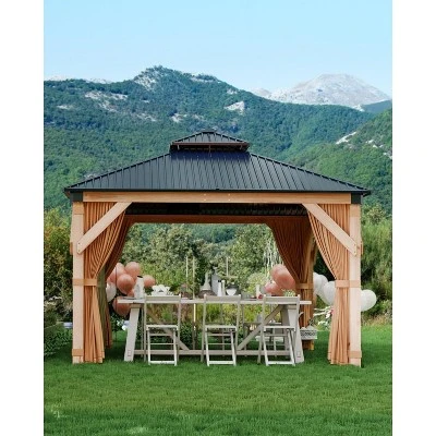 Introducing the 10×10 FT Hardtop Wood Gazebo, the perfect outdoor shelter designed to enhance your patio, deck, backyard, lawn, or garden. Crafted with a sturdy wooden frame and featuring a durable double metal roof, this gazebo offers exceptional protection against all weather conditions, ensuring you can enjoy your outdoor space year-round.