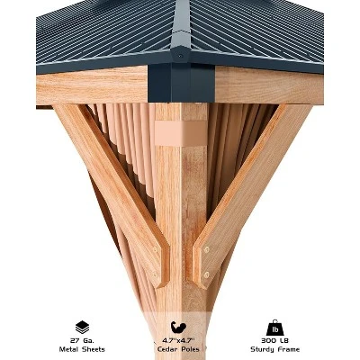 This wooden gazebo combines classic design with practical functionality. The spacious 10×10 size provides ample room for gatherings, dining, or relaxation, making it an ideal addition to any outdoor setting. The natural wood finish complements your garden or yard, creating a warm and inviting atmosphere.