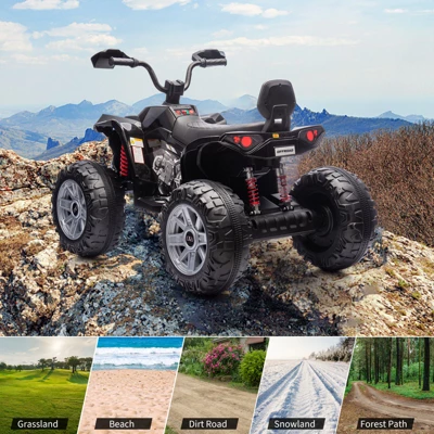 - [Multi-Function Entertainment System] Packed with LED headlights, a simulated dashboard, and realistic engine sounds, this ATV offers immersive fun. Integrated entertainment features include Bluetooth, story playback, TF card slot, USB port, and FM radio — keeping kids engaged and entertained during every ride.