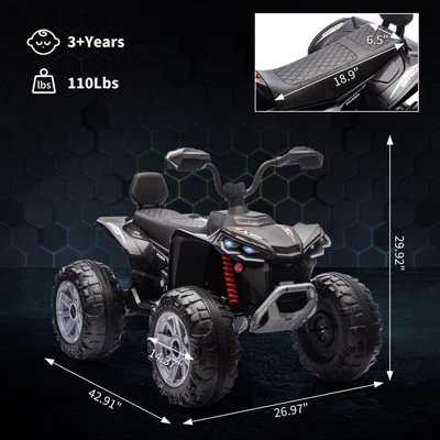 - [Spacious Two-Seater Design] This extended seat ATV comfortably accommodates two kids, so friends or siblings can enjoy the adventure together. Enhanced with a supportive backrest, it provides additional comfort and safety throughout the ride. Dimensions: 42.91″L x 26.97″W x 29.92″H; weight capacity: 110 lbs.