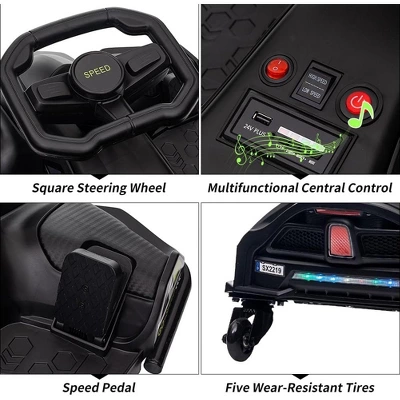24V Drifting Car for Kids 8-12 YearsOverall Size : 35.43″L*20.86″W*13.18″HRecommand Max Load : 110lbs(50kg)Recommand Max Height : 61″ (1.5m Tall)Battery : 24V 7AHMotor : 180WSpeed : 1.9-7.5mph(High/Low Speed Choice)Run Time: 1-2 Hours after 8-12hrs chargingWheels: 1 Front + 2 Rear + 2 Front Side Wheels (safe against rollover)Light: Front+ Tail LED Colorful LightPower Display and Low power AlarmWider Foot Pedal: The foot pedal is more wider , will provide more comfortable, more sensory control operation.Step foot pedal acceleration reaches up to 7.5 mph speed and drifting. Loose the foot pedal to soft brake.Multi-funtional Central Control: Light Control Button;USB,Music,Volume+-;Power Display and Alarm;High/Low Speed Button;Colorful Front+Tail Light: The dirft car equipped with cool front and rear light , you will be the happiest kid in the whole neighborhood, whether you are driving in day or night.
