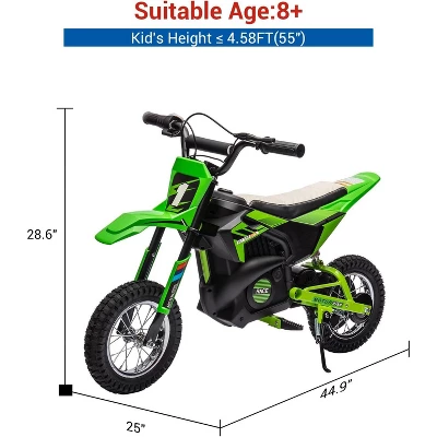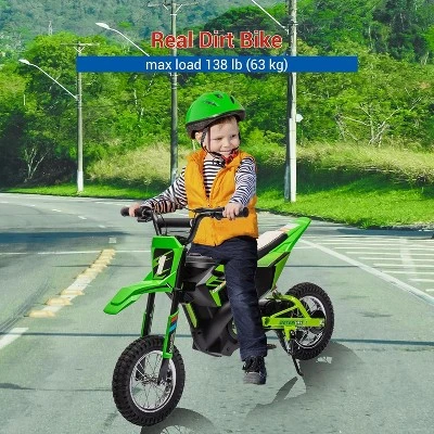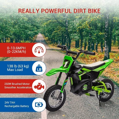 Give your child an exciting off-road adventure with our 24V Kids Electric Motorcycle! Designed for young riders, this dirt bike features a 250W motor with a top speed of 13.6MPH (22KM/H) and 30 minutes of continuous ride time on a single charge. The leather seat, air-filled tires, and metal suspension ensure a smooth and comfortable riding experience on various terrains.Key Features:âś” Powerful 250W Motor – Provides stable acceleration with a 24V 7AH rechargeable battery for extended playtime.âś” Safe & Easy to Control – Features a twist-grip throttle for speed control and a hand brake for quick stopping.âś” Comfortable Design – Padded leather seat, 12.6″ air-filled tires, and metal spring suspension absorb bumps for a smoother ride.âś” Durable Construction – Sturdy steel frame with max load capacity of 139 lbs (63 kg), suitable for kids up to 4.6FT (55″) tall.âś” Realistic Off-Road Experience – Designed like a motocross bike with a sleek green color for added fun.Safety & Specifications:Dimensions: 44.9″L x 25″W x 28.6″HRecommended Age: Check local guidelines (typically 6+ years with adult supervision)Battery: 24V 7AH (charger included)Tires: 12.6″ pneumatic (air-filled) for better tractionPerfect Gift for Kids – Ideal for birthdays, holidays, and outdoor play!