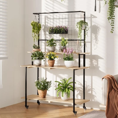 Description:Transform your indoor and outdoor garden with this versatile 3-tier plant stand with wheels, designed to combine functionality and style. Whether you’re looking to showcase your favorite flower pots, lush greenery, or unique plants, this multi-functional plant shelf rack offers ample storage and customizable display options. Featuring sturdy powder-coated iron and premium cedar wood construction, it supports heavy plants up to 200 lbs, ensuring durability and long-lasting use. The included gridwall panels and hanging plant rod provide extra space to hang and arrange your plants creatively, making it ideal as both a hanging plant shelf and flower display stand. Smooth swivel casters with locking mechanisms make moving your plants effortless and secure, perfect for adjusting their placement based on sunlight or decor changes. Easy to assemble with no additional tools required, this plant holder and display rack is a must-have for any home, garden, balcony, or office looking to add a touch of natural elegance and organized greenery.
