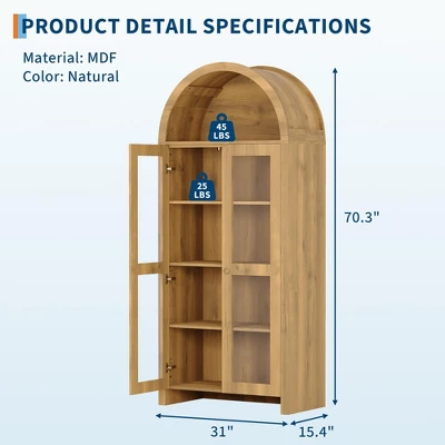 70 Inch Tall Arched Pantry Cabinet With Acrylic Doors – 5-Tier Adjustable Shelf, Wooden Storage, Modern Bookshelf For Kitchen, Dining, Living Room