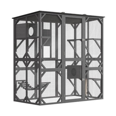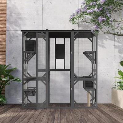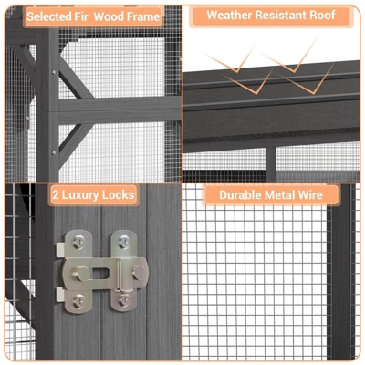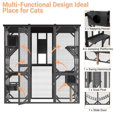 Create the perfect haven for your cat! Crafted from sturdy fir wood and anti-bite wire mesh for safety and visibility. Multi-level platforms fuel exploration—ideal for lively or multi-cat homes. Includes a scratch post, hammock, and two cozy shelters. Waterproof asphalt roof keeps it comfy all year. Step-up design suits all ages, with a rear sliding door for indoor-outdoor access. Easy assembly with dual-package shipping!
