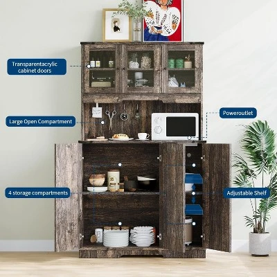 71″ Tall Pantry Cabinet with Charging Station, Farmhouse Kitchen Hutch Storage Cabinet with Microwave Stand,for Living Room, Dining Room