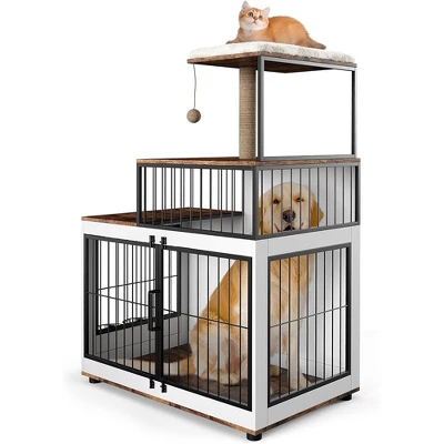 Dog Crate Furniture with Stairs, Wooden Dog Kennel Indoor with Double Doors, Furniture Style Dog Crate, Heavy Duty Dog Cage for Small/Medium Dogs, Multifunctional Cat Tree for Indor Cats