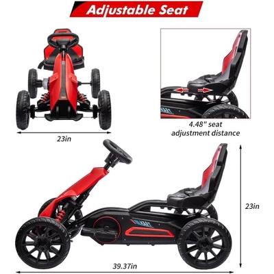 High-Safety for Todders — The low chassis + safety belt + non-slip foot pedal +anti-slip EVA tires + high/low speed choice will provide your child control the car easily and safety enough.Easy to Operate — The child need to step on the pedal to move forward or backward and control the steering wheel to change direction. Easy operation makes the go kart a wonderful present for boys and girls.Adjustable Seat– The go kart’s seat not only has 4 adjustment positions to suit the different needs of the user, but also provides a comfortable seating experience and relieves back muscle fatigue.