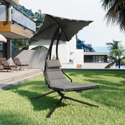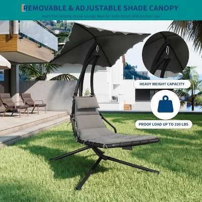 Relax in style with this hanging chaise lounge swing chair featuring a tempered steel cantilever frame that suspends you in comfort. The ergonomic curved seat supports your back perfectly, providing lumbar relief, while the built-in neck pillow adds extra comfort. Designed with sturdy X-shaped legs for stability and a removable canopy that offers shade from the sun, this lounge chair is perfect for any indoor or outdoor space—including patios, gardens, pools, and porches. The removable cushions and canopy are easy to clean, helping maintain the chair’s look and longevity. Lightweight and easy to assemble with all necessary hardware and detailed instructions included.