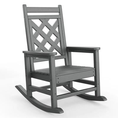 With its modern wood-textured finish, this versatile rocking chair complements any outdoor setting, from poolside lounging to cozy evenings around the fire pit. Elevate your outdoor living space with a chair that combines comfort, durability, and timeless style.